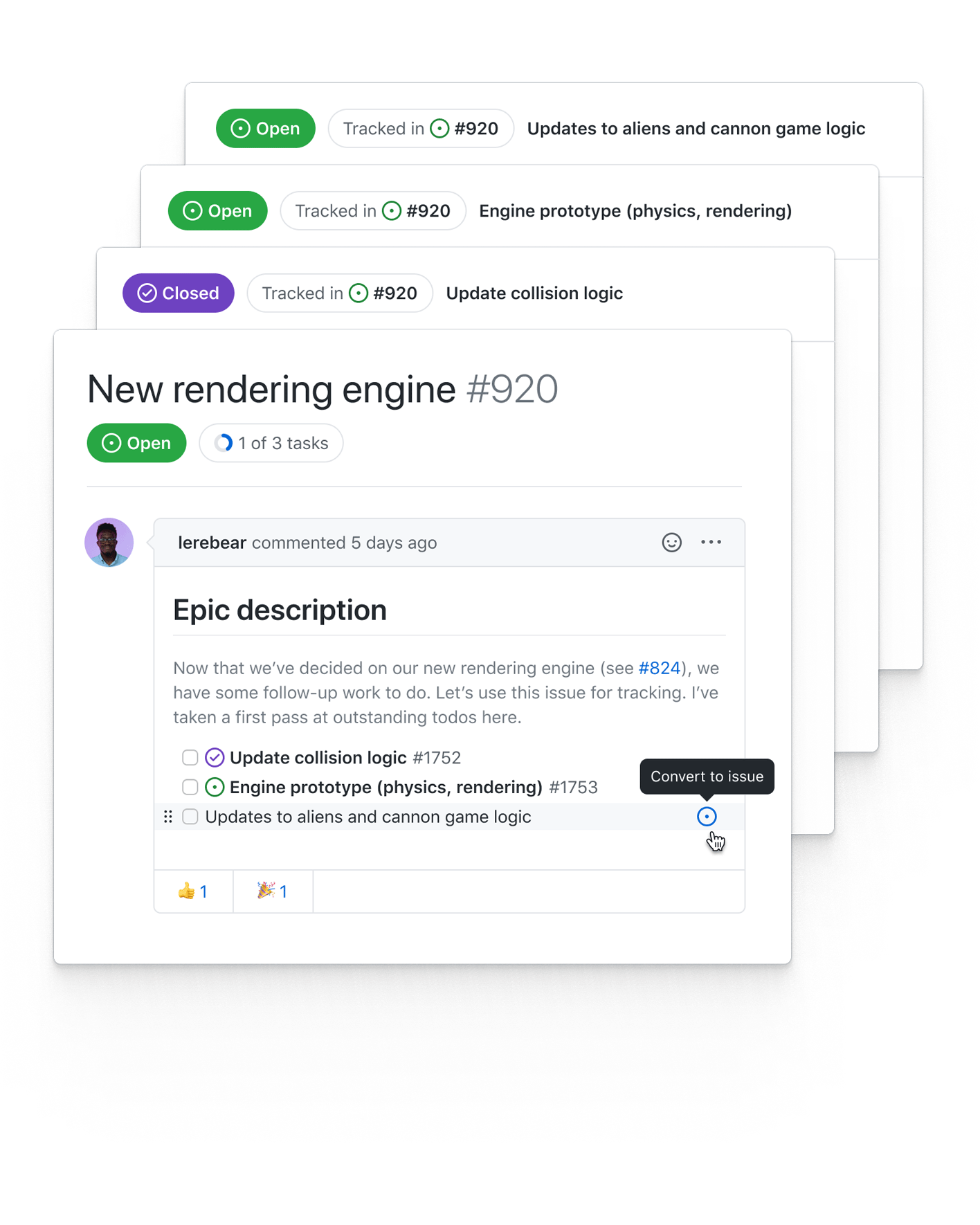 Turn ideas into products with project boards and tables that integrate directly into your workflow—and link directly to your Issues. Plan your sprints, break out individual tasks, track progress, and ship software fast.